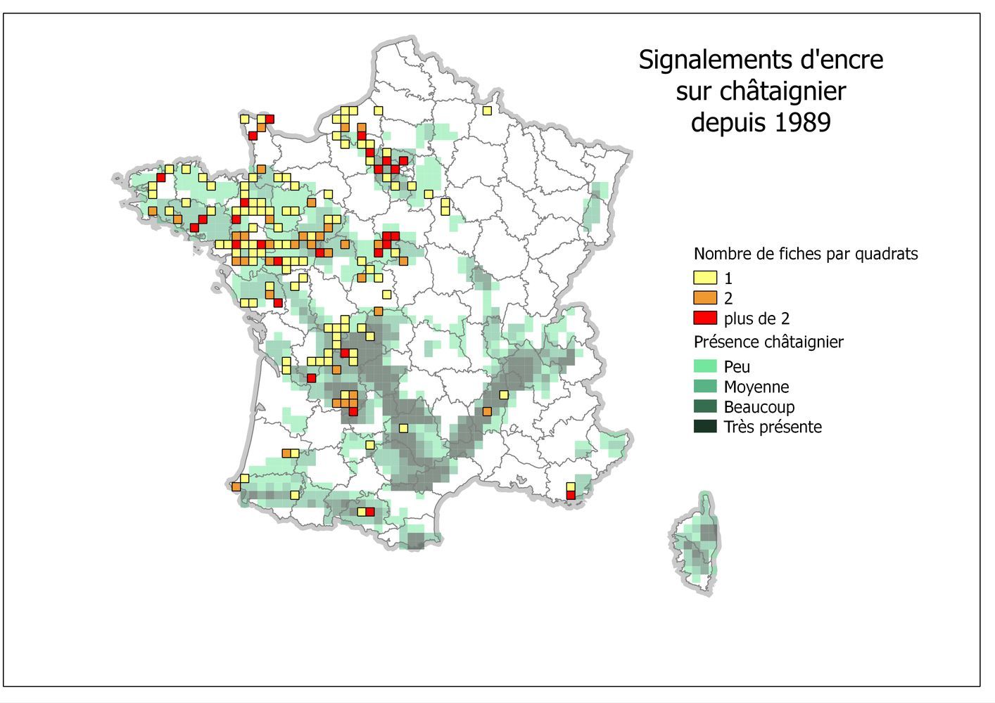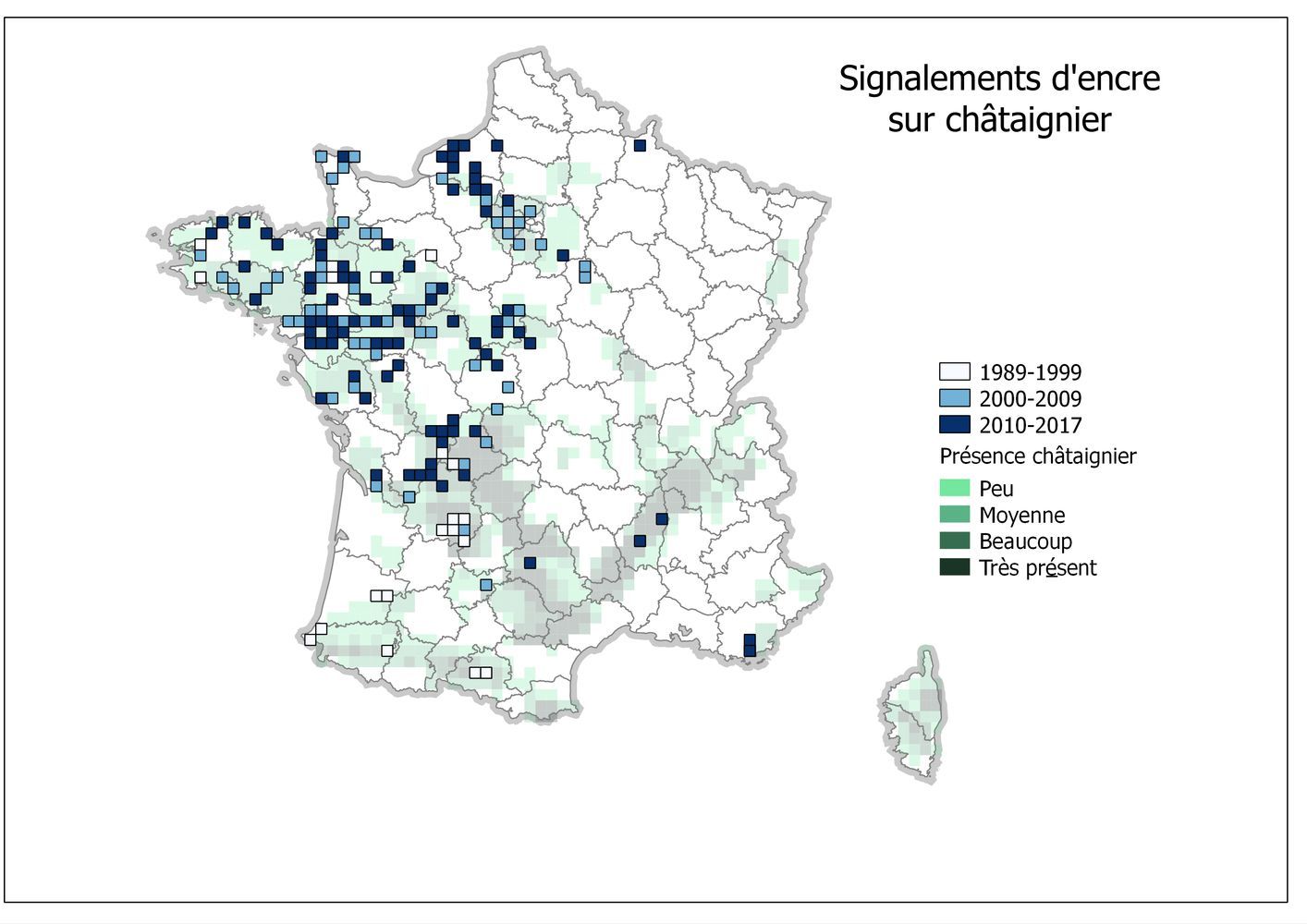 Le plus ancien est la maladie de l'encre, provoquée par Phytophthora cinnamomi et P. cambivora. Ces Phytophthora détruisent les fines racines et peuvent progresser dans les racines principales jusqu'au collet. L'eau libre des sols favorise leur dissémination à courte distance. Leur isolement à partir de tissus infectés est difficile et les symptômes associés sont peu spécifiques. Ils peuvent être facilement confondus avec des dépérissements consécutifs à une attaque d'armillaire ou à une asphyxie racinaire par hydromorphie par exemple. La répartition de ces deux Phytophthora dans la châtaigneraie française est donc probablement sous estimée. P. cambivora semble peu fréquent et les signalements en forêt concernent essentiellement la partie nord de la France. P. cinnamomi est mentionné plus fréquemment ; des cas d’encre sont rapportés en forêt dans toute la partie ouest et sud-ouest de la France et P. cinnamomi a été isolé dans des taillis et vergers de châtaignier dans le sud-est. Seul l'Alsace et le nord des Alpes semblent pour le moment indemnes. Cette généralisation à l'ensemble de la châtaigneraie s'explique en partie par des facteurs climatiques non limitants mais résulte essentiellement de l'introduction en forêt de plants initialement contaminés en pépinière et de la dissémination de fragments de sol contaminés (rôle des engins d'exploitations?).