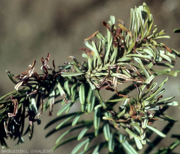 - Chez les résineux, le bord des aiguilles est découpé en dents de scie, puis celles-ci se vrillent, jaunissent et se dessèchent.