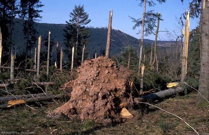 L’intensité et la gravité des dégâts dus au vent dépendent de nombreux facteurs : vitesse et direction du vent, accompagnement de précipitations plus ou moins fortes, nature du sol, expositions, pente, type d’essence, âge, conduite des peuplements (développement du système racinaire, prise au vent…).