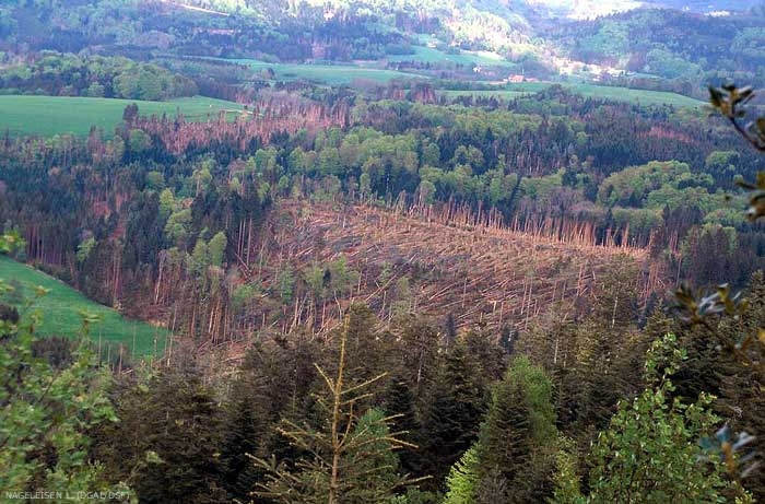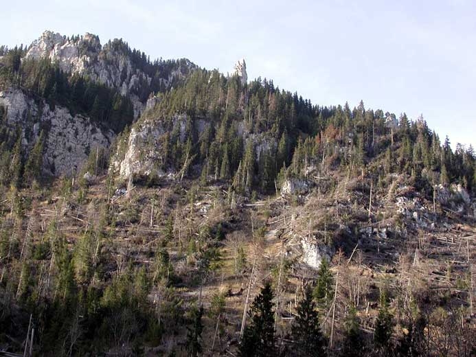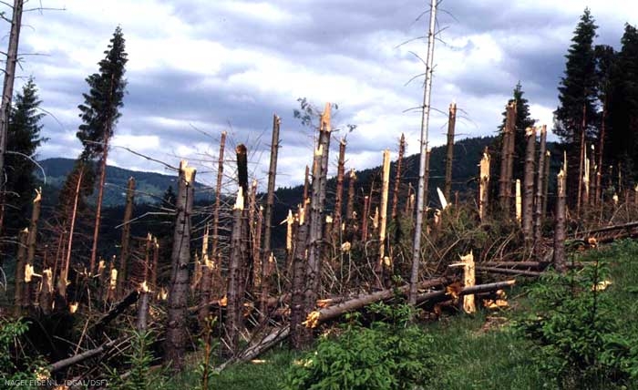 La constitution de trouées liées à des problèmes divers (foudre, armillaire, scolytes…) est un facteur aggravant la sensibilité au vent, particulièrement dans les futaies monospécifiques.