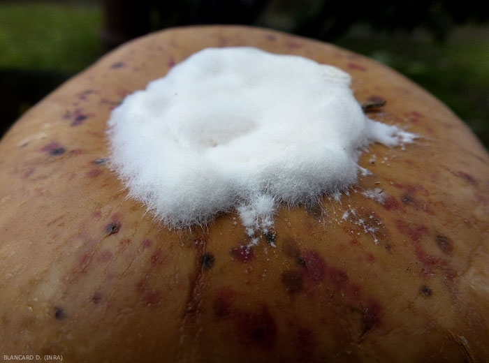 Les lésions étaient souvent humides, ou sèches et spongieuses (figure 5), conduisant à une pourriture, les tissus affectés se couvrant soit d'un mycélium blanc (figure 6) à rosâtre (figure 7), soit de sporodochies orangés (figure 8).