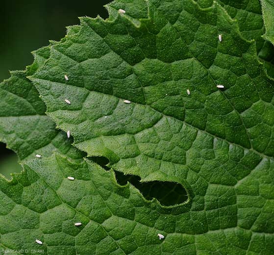 Comme pour les pucerons, les nombreuses piqûres et succions alimentaires occasionnées par les aleurodes présents sur le feuillage (figure 1) provoquent un ralentissement du développement des plantes.