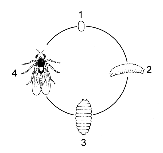 Les mouches mineuses ont 6 stades de développement au cours de leur cycle (figure 1) : oeuf, 3 stades larvaires, pupe et adulte.