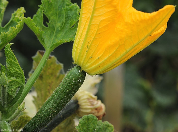 En plus des colonies de pucerons, on observe bien souvent des mues blanches et la présence de miellat à la surface des organes aériens de la courgette sur lequel se développe la Fumagine (sooty mold) (figure 5). Rappelons que cette dernière peut avoir plusieurs conséquences, notamment une réduction de la photosynthèse et de la respiration foliaire et la souillure des fruits rendus ainsi non commercialisables.