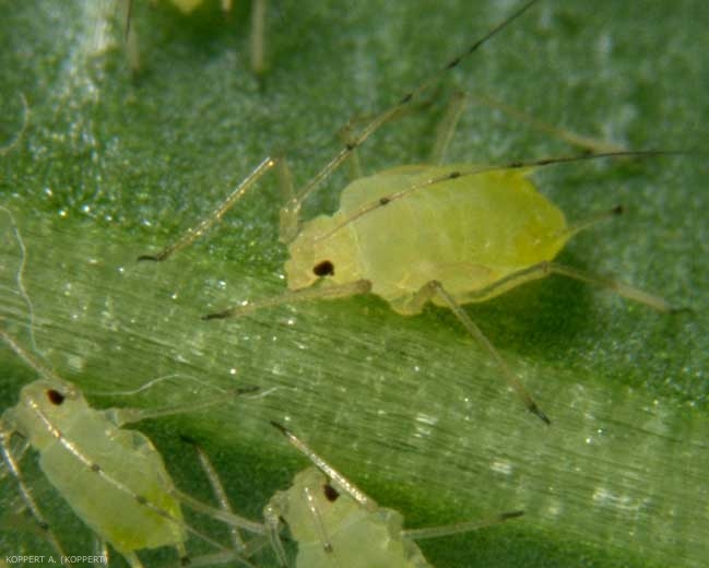 Quelques plantes dispersées dans la culture sur lesquelles des colonies de pucerons prennent rapidement de l'importance constituent les premiers foyers. D'abord aptères, les pucerons commencent par visiter les plantes voisines. Dès que les ailés apparaissent (lors de pullulations), ils se dispersent dans la culture ou dans des parcelles à proximité. Les plants et les ouvriers peuvent contribuer à leur dissémination.