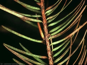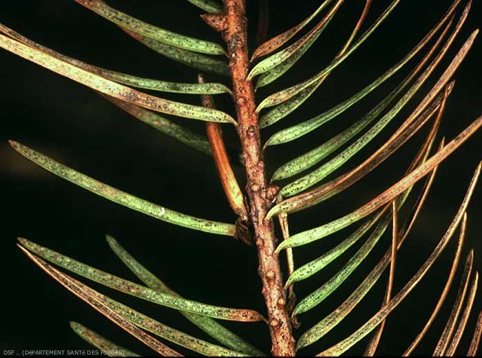 Apparition de tachetures chlorotiques sur les aiguilles et présence de ponctuations noires (fructifications) le long des lignes de stomates à la face inférieure des aiguilles atteintes. Les aiguilles atteintes deviennent rapidement brunes avant de tomber prématurément. La défoliation commence par les plus vieilles aiguilles. En cas de fortes attaques, la chute des aiguilles antérieures à l'année en cours, ne laissent subsister que le pinceau vert des aiguilles de l'année pouvant conduire à de forte défoliation.