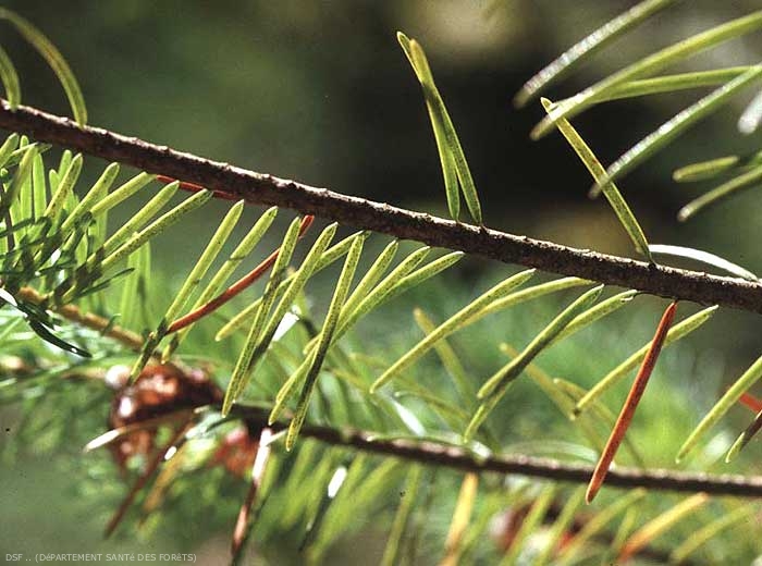 Défoliation plus ou moins complète des rameaux. Dans les cas les plus graves, seules les aiguilles de l’année et quelques aiguilles de l’année antérieure subsistent. Les dégâts apparaissent plus intenses au printemps avant débourrement des arbres. La croissance des arbres est dans ce cas retardée.