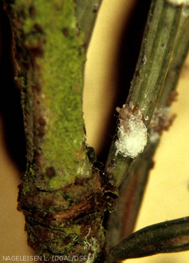- Douglas : sur aiguilles au début du printemps, larves sous la forme de petits points noirs à la face inférieure des feuilles, puis apparition de petites boules blanches correspondantes aux insectes recouverts de sécrétions cireuses (figures 1 et 2). En été, taches jaunâtres dues aux piqûres et déformations des aiguilles.