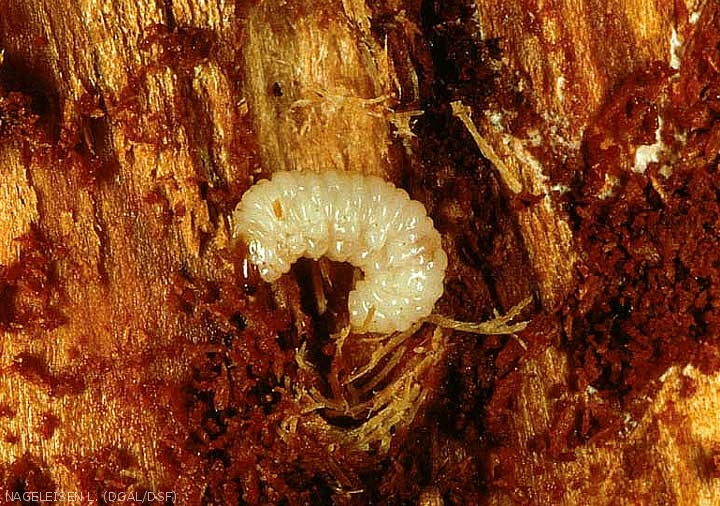 - galeries sous-corticales rayonnantes à partir d'un point central s'élargissant progressivement pour se terminer par une logette de nymphose ovoïde entourée de fins copeaux.
