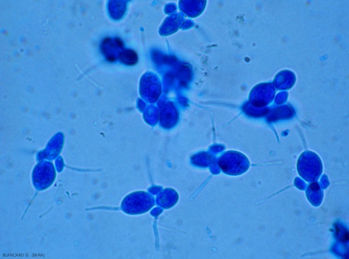 Notez que les spores sont dispersées par le vent et les pluies, et que les premières taches apparaissent 10 à 14 jours après les infections.