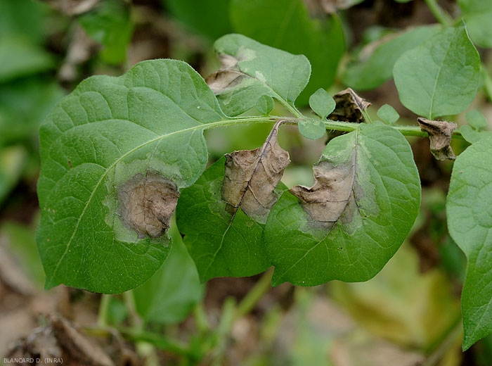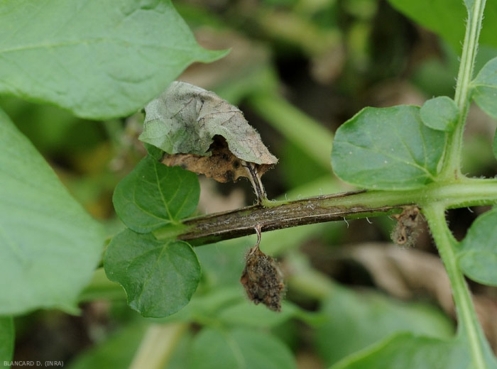 En cas de fortes attaques, lce dernier peut progresser vers les tubercules, les contaminer, et engendrer une pourriture brune brune à noirâtres, superficielle et interne, ceci notamment au cours de la conservation (figures 6, 7 et 8).