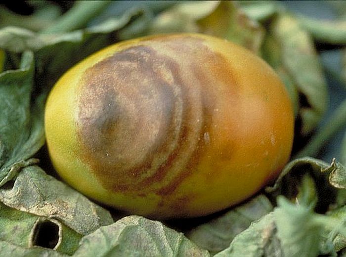 Il faut savoir qu'il existe un autre mildiou, qualifié de "mildiou terrestre", qui est provoqué par un organisme différent, Phytophthora parasitica. Les symptômes de ce mildiou apparaissent plus tôt en saison que ceux du mildiou aérien. On peut observer le développement d'une lésion (appelée aussi chancre) de couleur brune qui est située à la base de la tige lorsque les contaminations ont lieu à la plantation. L'organisme peut également attaquer les fruits sur leur face entrant en contact avec le sol (figure 7), entraînant des confusions avec les symptômes sur fruits de mildiou aérien.