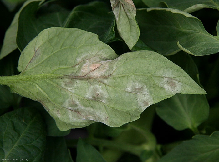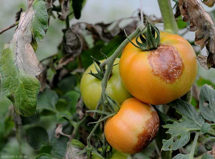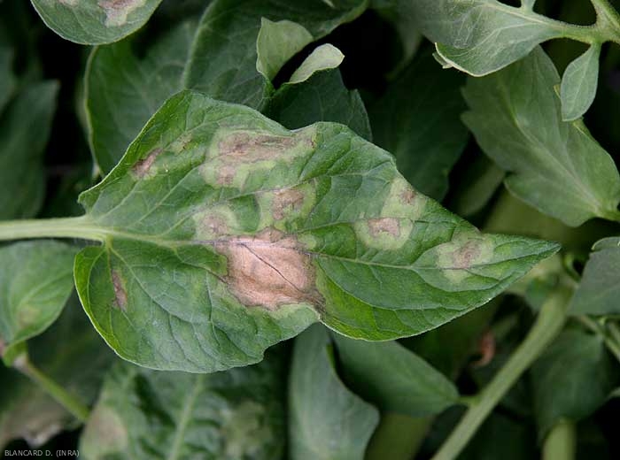 Le mildiou classique, provoqué par Phytophthora infestans, affecte toutes les parties aériennes de la tomate d'où son appellation de "mildiou aérien". Il attaque d’abord les feuilles, occasionnant d'abord des taches translucides qui prennent par la suite un aspect huileux et présentent un centre nécrotique noirâtre avec une marge livide. Très vite, les taches foliaires se rejoignent et la zone foliaire attaquée se déforme et se recroqueville (figures 1 et 2).