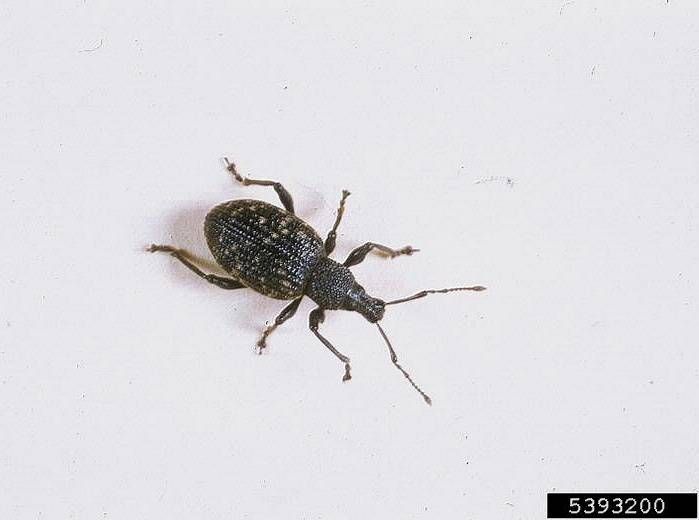 L’adulte est noir, avec des élytres fusionnés (figure 2). Même s’il possède des ailes, il est donc incapable de voler. Il se nourrit des feuilles.