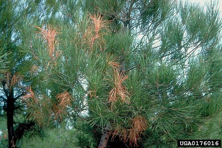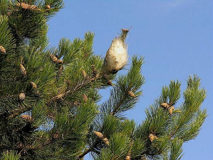 Les dégâts sont causés par les chenilles qui s’installent à l’extrémité des branches de pin. En effet, dès la fin de l'été, l'extrémité des pousses jaunit (figure 1) et des petits nids de soie se forment (figure 2). Plus tard, ces nids deviennent de grosses bourses, avec présence des chenilles à l’intérieur ou à leur proximité.