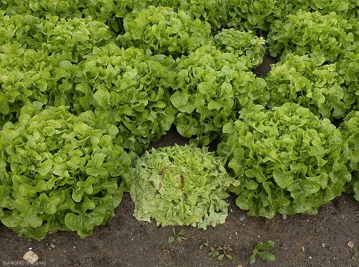 En fin de végétation, les plus extérieures puis l'ensemble des feuilles jaunissent et flétrissent brutalement (figure 1). Par la suite, les plantes fondent littéralement sous les effets d'une pourritures humide (figure 2).