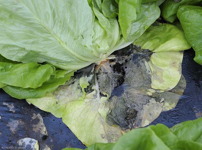 Le Botrytis (Botrytis cinerea), un autre champignon s’attaquant aux feuilles basses (figure 3) et au collet (figure 4) des salades et beaucoup plus généraliste (affectant aussi tomates, courges, haricots, fraises …), produit un feutrage caractéristique gris sur les tissus pourris (moisissure grise) (figure 5). Notons qu'un autre champignon, Rhizoctonia solani, peut occasionner des pourritures au collet des salades (photo 6). Dans ce cas, les tissus lésés ne présentent pas de structures particulières comme du mycélium visible ou des sclérotes.