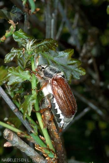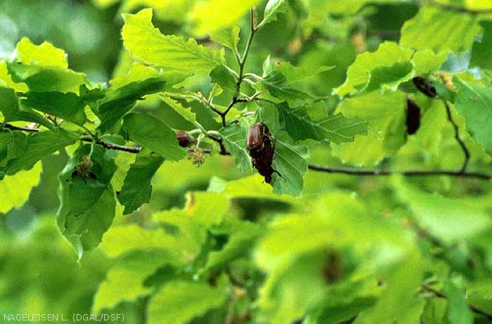 - Défoliation des arbres adultes au cours du mois de mai par de gros coléoptères