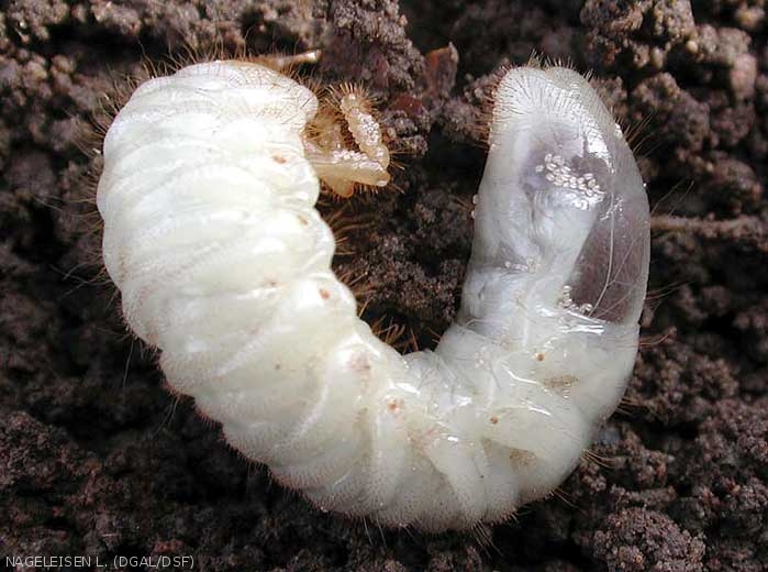 Dommages larvaires du hanneton commun essentiellement en pépinière ou dans des boisements de terre agricole