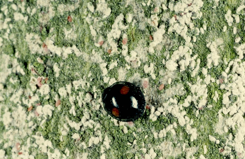 Feutrages floconneux recouvrant les écorces en plages discontinues, recouvrant des petites larves ovoïdes jaune orangé durant l'hiver.