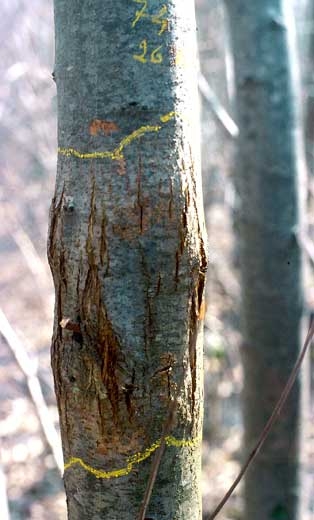 Il existe un virus hyper parasite (parasite du champignon) utilisé en lutte biologique. Les souches de champignon hypovirulentes (=infectées par l’hypovirus) progressent peu à l’intérieurde l’arbre. Elles sont arrêtées par le périderme: le bois n’est pas attaqué, une partie importante du phloème non plus. Le chancre reste alors très superficiel. Les souches hypovirulentes ne se reproduisent pas de manière sexuée (elles ne sont plus capables de produirelesascogones). Il y a aussi diminution du nombredeconidies. Cela réduit la dissémination naturelle de ces souches. Le virus se transmetd’une souche de champignon àl’autre quand ces 2 souches fusionnent (il faut donc que ce soit 2 souches du même groupe de compatibilité végétative). L’hypovirus est bien installé dans les peuplements anciennement infectés (moitié sud de la France): les chancres sont en cours de cicatrisation, ne provoquent plus de mortalité.