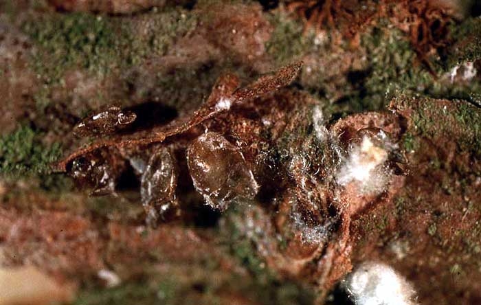 filaments cireux couvrant comme d'une sorte de coton hydrophile les nymphes mâles et les oeufs dans les anfractuosités de l'écorce