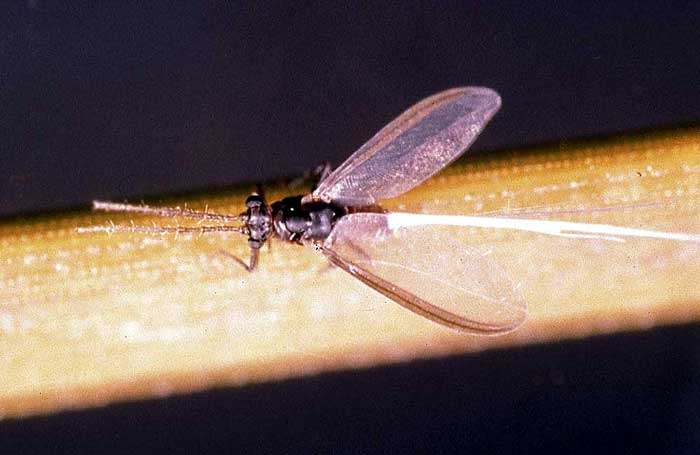 Les adultes apparaissent fin janvier (femelles aptères, mâles ailés).