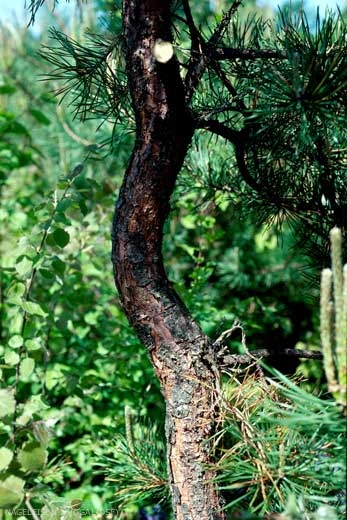 - Les spores infestent l'assise cambiale des jeunes pousses de pin. Il en résulte un ralentissement de la croissance du côté de l'infection ce qui occasionne une courbure. Puis, la pousse se redressant, elle forme un "S" caractéristique. Développement ralenti des pousses de pin, avec parfois un dessèchement.