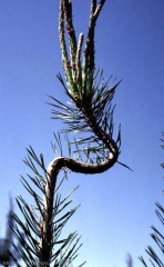 Courbures occasionnées par un lépidoptère Rhyacionia buoliana (tordeuse des pousses de pins). Dans ce cas, elles débutent à la base de la pousse qui est le plus souvent minée et de nombreux bourgeons sont évidés.