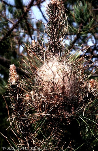 - A la fin de l’automne, les nids d’hiver à tissage soyeux, dense et blanc s’individualisent dans les parties bien en lumière des arbres. En hiver, la consommation des aiguilles peut aller jusqu'à la défoliation totale.