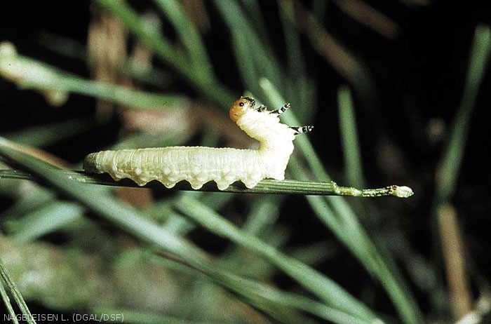 Les oeufs sont déposés en ligne par les femelles, dans des fentes pratiquées dans les aiguilles à l'aide de leur ovipositeur en dent de scie (d'où le nom de "mouche à scie", "saw fly" en anglais, qui leur est donné), et recouverts d'une substance brune. L'éclosion des fausses chenilles (larves) a lieu 3 à 4 semaines plus tard.