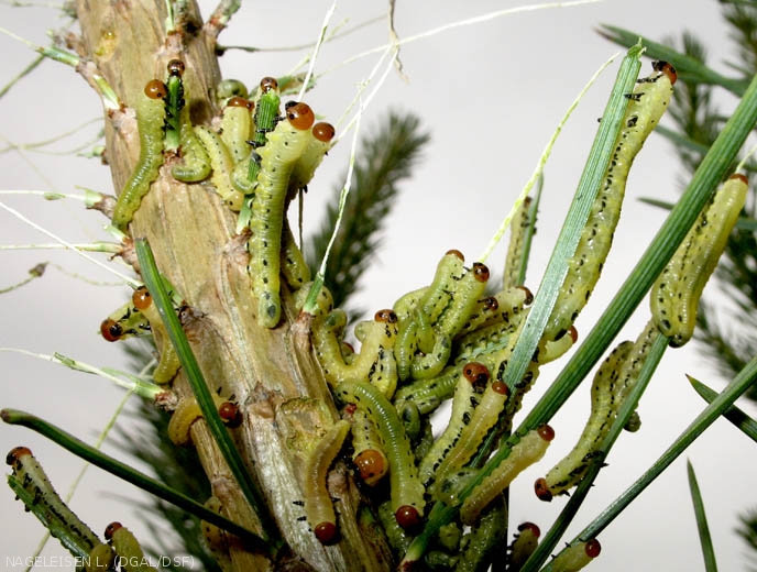 - Présence de larves vertes en colonies qui se dressent en mouvement en S pour "impressionner". Fausse chenille, 25 mm en fin de développement, à 8 paires de fausses pattes abdominales, tête rousse, corps ivoire avec une série longitudinale latérale de taches noires ou grises jusqu’à l’avant dernier stade larvaire. Au dernier stade, la tête est pâle et les taches noires sur le corps ont disparu.