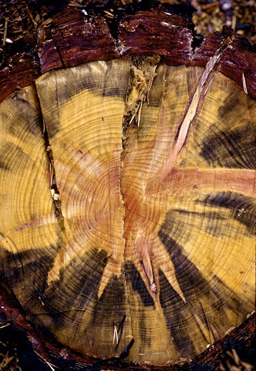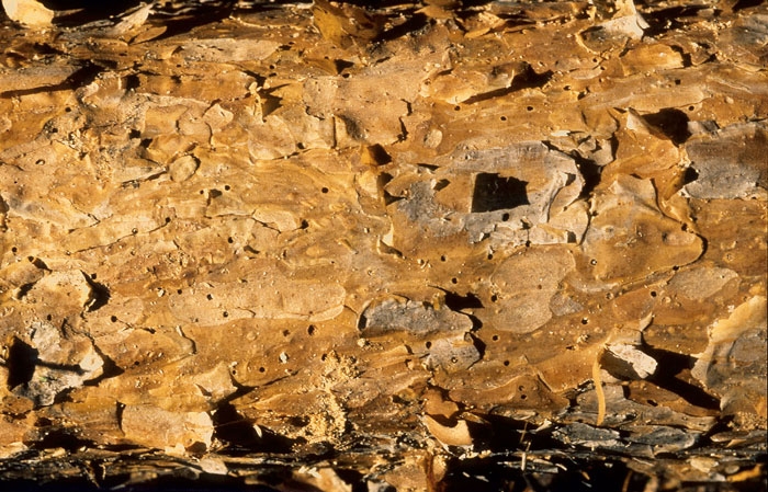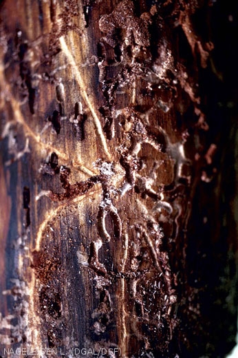 - Galeries sous-corticales caractéristiques avec une galerie étoilée longitudinale à 2-8 branches. Longueur 20 cm, largeur 1,3 à 1,4 mm