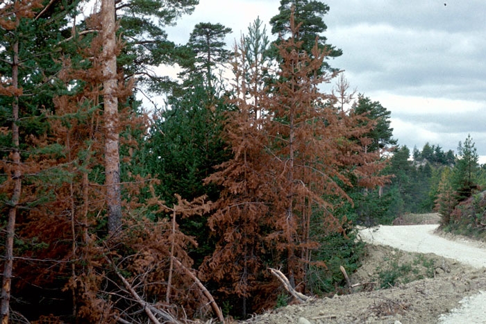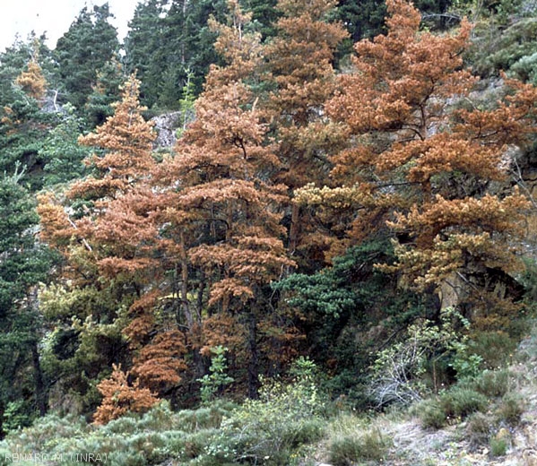 - Aspect clairsemé et brunissement des houppiers.