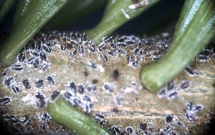 - des points blancs (aspect d'un petit tampon d'ouate dû aux sécrétions cireuses de l'insecte) apparaissent sur les jeunes axes. Ces points ne s'observent qu'une fois dans l'année (leur densité est maximale au printemps), mais les insectes sans cires sont visibles au printemps sous forme de petits points noirs (larves mobiles) ;