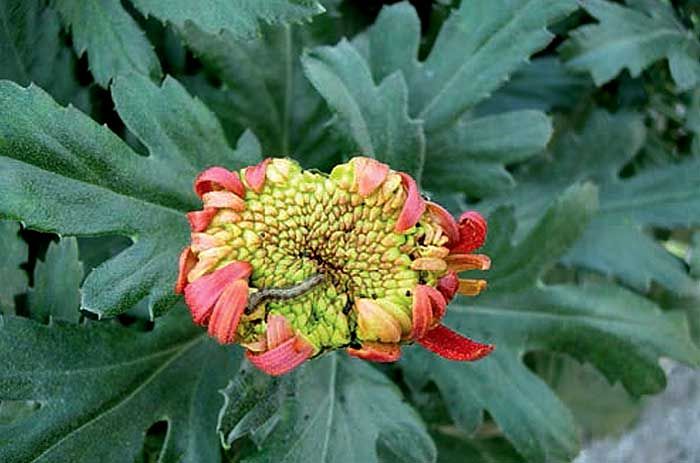 Les tiges et les organes floraux et foliaires sont dévorés. De même, des trous sont observés sur les boutons floraux, les pétales et les feuilles.
