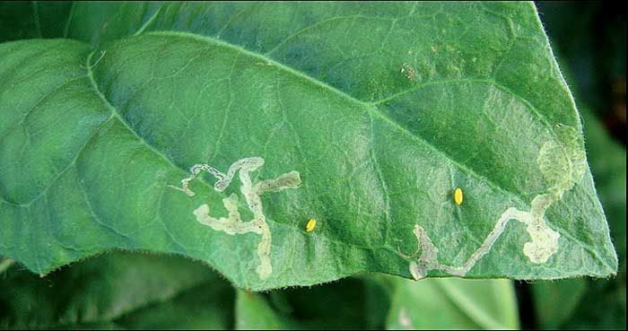 Ainsi, sous serre, les mineuses peuvent être observées dès février jusqu’au retour des grands froids, voire tout au long de l’année en ce qui concerne la mineuse américaine.