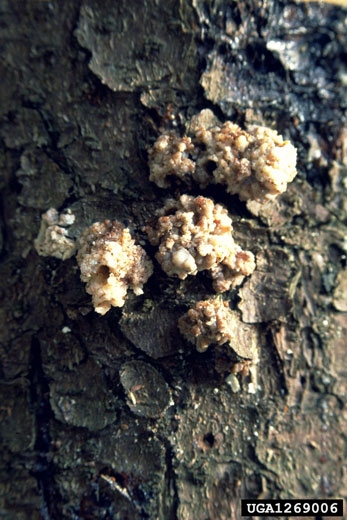 Les végétaux atteints présentent des écoulements de résine à laquelle se mêlent sciure et déjections. Ces écoulements sont observés au niveau des orifices de pénétration de l’insecte, qui mesurent 5 mm de diamètre environ. Une fois l’écorce retirée, des galeries sinueuses contenant des larves par paquets ou des adultes peuvent être observées.