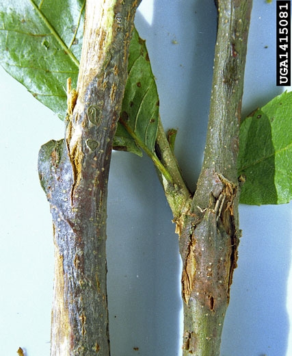 Une fois que le chancre a entouré la branche ou le tronc, la sève circule mal et les parties végétales situées au dessus du point d’infection présentent des feuilles petites, desséchées, qui ne tombent pas. En périodes chaudes, lorsque les besoins hydriques de l’arbre sont importants, ces symptômes peuvent apparaître de manière brutale. En cas de forte contamination, ces parties peuvent dépérir.