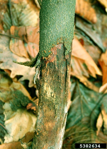 Si l’écorce est grattée au niveau du chancre, le réseau de mycélium jaune en forme d’éventail peut être observé. Ce réseau caractéristique est plus visible encore lorsque l’écorce est mouillée.