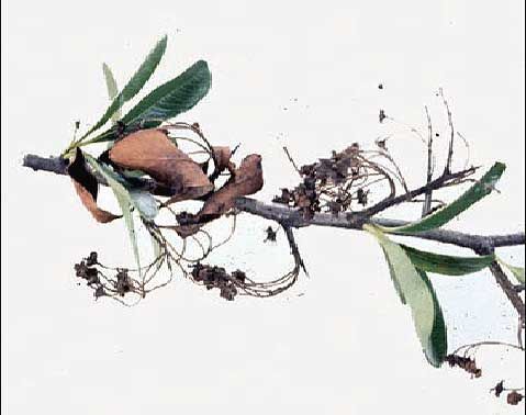 Les inflorescences se dessèchent et noircissent de manière partielle ou totale tout en restant attachées à l’arbre.