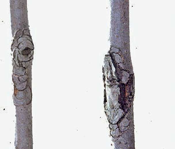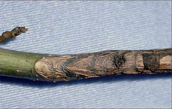 Enfin, parfois, ce sont les racines des porte-greffes sensibles qui sont atteintes. Dans ce cas, la partie végétative de l’arbre ne présente d’abord aucun symptôme et une fois que le chancre a encerclé le tronc du porte-greffe, le haut de l’arbre présente un dépérissement généralisé.