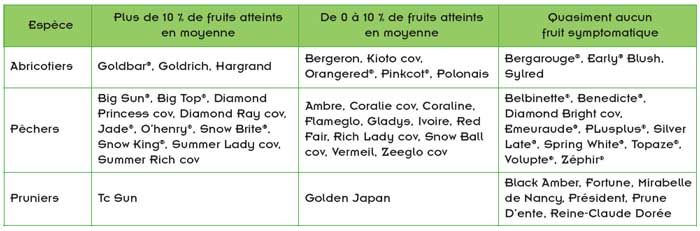 La sensibilité des variétés de Prunus fruitiers a été évaluée par le Ctifl. Cette sensibilité a été jugée selon l’incidence de la maladie sur les fruits sur une période de 4 saisons.