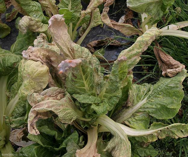 - Attaques sévères : jaunissement des feuilles, entraînant leur flétrissement complet ou celui de la plante entière (figures 7 et 8).
