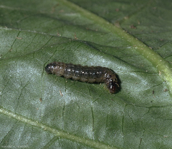 Chenilles : visibles au travers de la coquille la veille de leur émergence. En fin de développement, elles mesurent entre 20 et 30 mm de long et sont blanc crème à brunes. Le long de la surface dorsale du corps, se trouvent des paires de points foncés. La tête sombre est également remarquable, comme les quatre points foncés situés derrière la capsule de la tête. Les chenilles possèdent quatre paires de fausses pattes (figures 2 et 3).