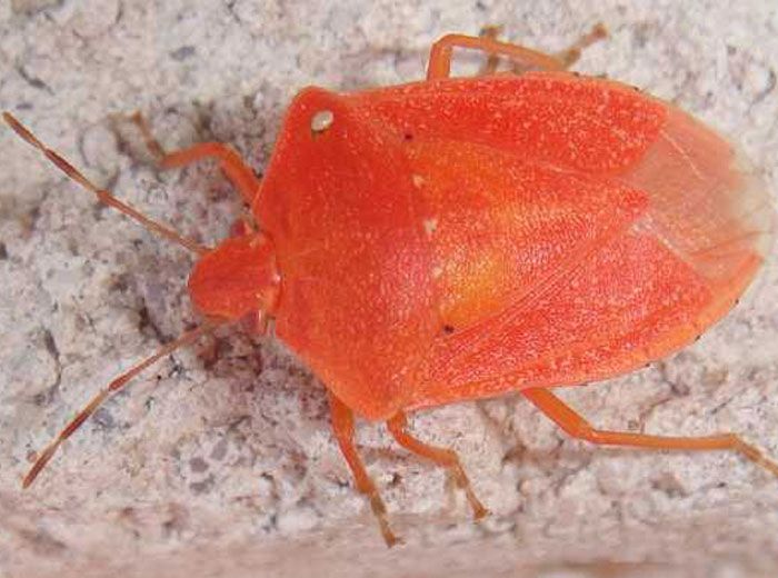 Adultes : punaises entièrement vertes (devenant marron en hiver), en forme de bouclier et mesurent environ 13 mm. Ils possèdent 3 à 5 points pâles sur le devant du pronotum et ont les yeux rouge foncé ou noirs. Les segments antennaires adjacents sont alternativement foncés ou clairs et les ailes recouvrent complètement l’abdomen. De petites taches noires sont visibles de chaque côté du corps. Juste après leur émergence, elles sont d'un rose vif, avant d'obtenir une coloration verte ou marron.