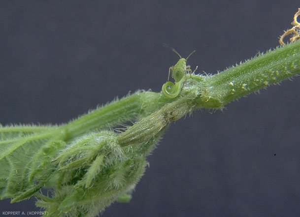 Les oeufs sont en forme de bouteille, de couleur crème et mesurent 1 x 0,25 mm. Les larves sont plus petites et vertes et se déplacent très rapidement sur les plantes (figure 4). On compte cinq stades larvaires. Lorsque la larve grandit, les ébauches alaires deviennent plus visibles.