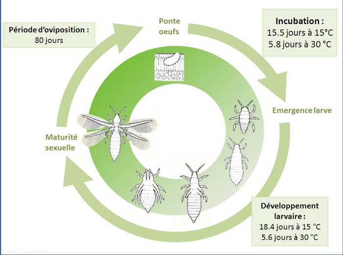 Ci-dessus le cycle de développement d'Echinothrips americanus.