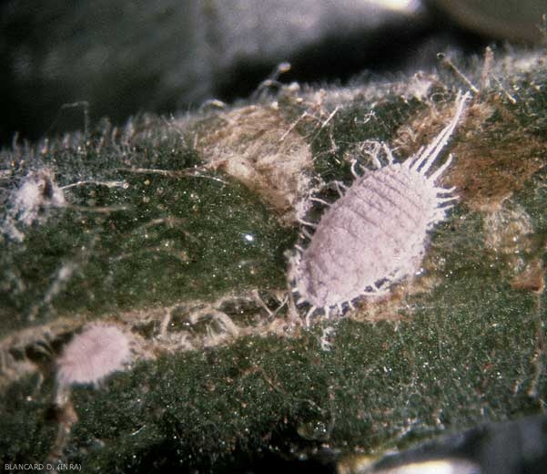 Larves: à la naissance des larves mobiles d' environ 0,5 mm. Puis les stades suivants ressemblent aux femelles adultes. Les larves femelles possèdent déjà de courts filaments cireux qui sont absents chez les mâles.