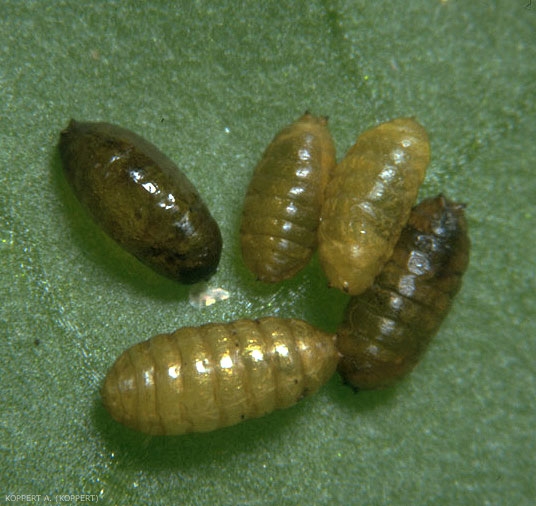 Pupe : la couleur varie entre ocre et marron foncé, ou parfois noir Elle mesure environ 0,9 - 2 mm (figures 5, 5 et 6).